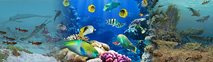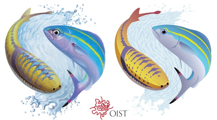 The jawless Paleozoic fish Sacabambaspis represents early vertebrate evolution, the origin of skeletal systems, and deep-time ecological structure. The modern reef fish Caesio diagramma (gurukun / タカサゴ), Okinawa’s prefectural fish, represents contemporary biodiversity, community assembly, and functional ecology in Indo-Pacific systems.