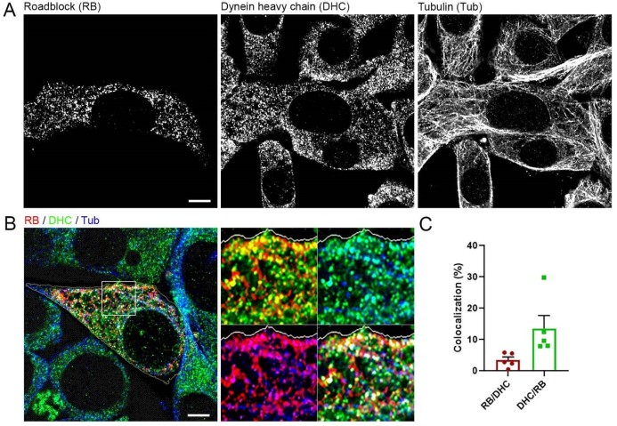 Neurons are highly polarized cells with an elongated axon that extends far away from the cell body. In order to maintain neuronal homeostasis, neurons rely extensively on axonal transport of membranous organelles and other molecular complexes. Axonal transport plays a central role in the establishment of neuronal polarity, axonal growth and stabilization and synapses formation, allowing for precise spatio-temporal activation and modulation of numerous molecular cascades. Anterograde and retrograde axonal transport is supported by various molecular motors, such as kinesins and dyneins, and a complex microtubule network. Cytoplasmic dynein is the main retrograde molecular motor and is constructed around the heavy chain, which is the force-generating subunit and is composed of a motor and a tail domain. The former is responsible for motility generation while the latter acts as a platform for the association of other subunits, such as the intermediate, light-intermediate and light chains, which collectively mediate the direct and indirect binding/association of cargos. Roadblock 1 (DYNLRB1) is one of the 3 light chain families and was presumed to be an accessory subunit for specific cargoes. Recent work demonstrated that DYNLRB1 depletion in proprioceptive neurons significantly impairs retrograde axonal transport and consequently compromises neuronal survival (Terenzio et al., 2020). This observation suggests that DYNLRB1 is an essential subunit for dynein-mediated transport.