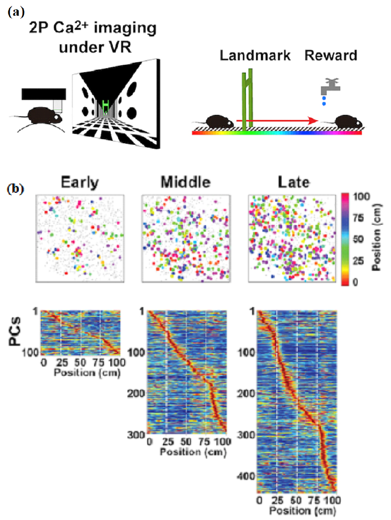 Figure 2: Representations of landmarks and rewards in CA1. (a) Visual information including landmarks and reward points was given to mice running on a trackball through a virtual reality system. (b) As learning proceeded, the hippocampus recruited an increased number of place cells (PCs) for representing the locations of landmarks and rewards.