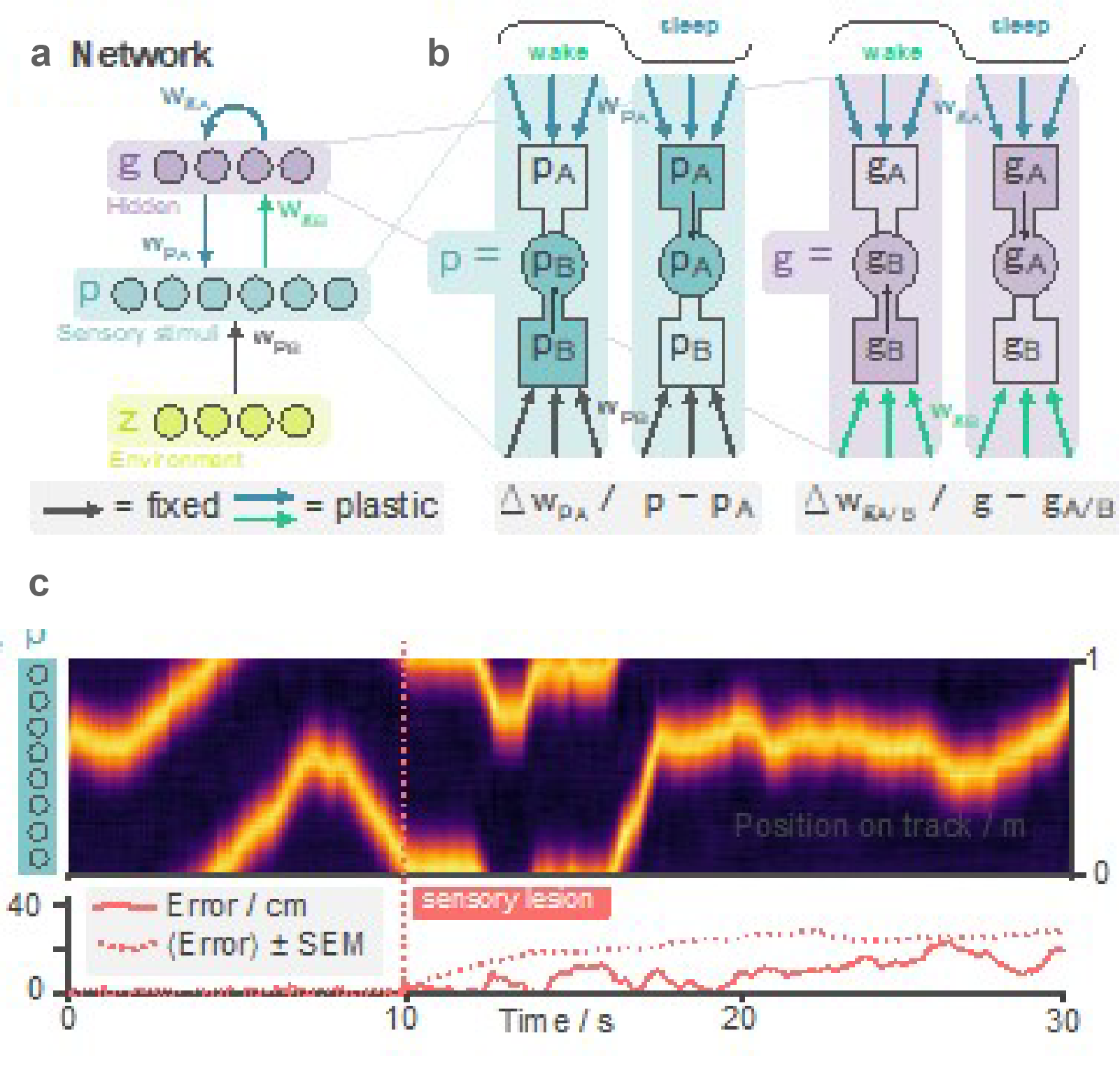Fig. 1: A biologically plausible generative model is trained with theta frequency wake-sleep cycles and a local learning rule. (a) Network schematic: high-D stimuli from an underlying environmental latent, z, arrive at the basal dendrites of the sensory layer, p, and map to the hidden layer, g (this is the inference model, weights in green). Simultaneously, top-down predictions from the hidden layer g arrive at the apical dendrites of p (this is the generative model, weights in blue). (b) Neurons in layers p and g have three compartments. A fast oscillation gates which dendritic compartment – basal (pB, gB) or apical (pA, gA) – drives the soma. A local learning rule adjusts input weights to minimise the prediction error between dendritic compartments and the soma. (c) Path integration ability is demonstrated in a lesion study: after 10 seconds in the normal oscillatory mode the network is placed into sleep mode (aka generative mode), lesioning the position-dependent sensory inputs. Despite this HPC continues to accurately encode position, evidence that the MEC ring attractor is path integrating the velocity inputs and sending predictions back to HPC. Lower panel shows the accumulated decoding error as well as the mean±SEM over 50 trials.