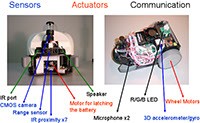 The Cyber Rodent robot has an omnidirectional vision system as its eye, infra-red proximity sensors as its whiskers, two wheels for locomotion, and a three-color LED for emotional communication. Especially the Cyber Rodent has the specific capabilities of surviving by recharging from external battery packs and reproduction in software by exchanging genes (programs or data) via an infrared communication ports.