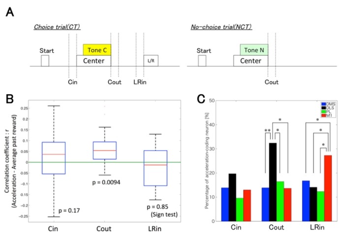 First, to examine which trial phase was related to the reward-motivated behavior, we analyzed rat’s head acceleration during 3 phases in CC (Cin: 200 ms until the center hole poke, Cout: 200 ms from moving out of the center hole, LRin: 200 ms until the left or right hole poke, Fig.1A). We found that the acceleration was significantly correlated with the mean reward of the past 6 trials only in Cout phase (Fig.1B). A regression analysis of neuronal activity revealed that the proportion of neurons coding the acceleration in Cout was significantly larger in DLS than in the other areas (DMS: 14%, DLS: 32%, PL: 16%, M1: 14%, Fig.1C).