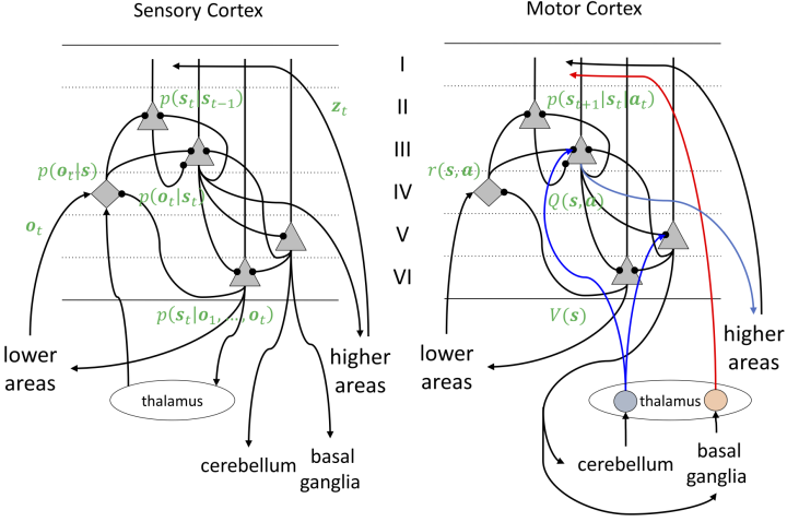 In the neocortex, while the posterior half is mostly involved in sensory perception and the frontal half is mostly involved in actions, the common six-layer architecture is preserved, know as the canonical cortical circuit (Douglas and Martin, 2017). Based on the duality of dynamics Bayesian inference and optimal control, we hypothesized that the sensory and motor cortices implement these computations in similar neural circuits (Doya, 2021).