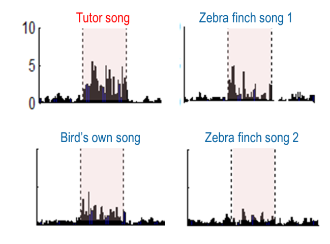 Like humans learning to speak song birds learn to sing during development by hearing their tutor song. One of the song bird zebra finches hear their father song after hatching and memorize during in the sensory learning period. In the following (with a large overlap) sensory-motor learning period birds start to sing and match their own vocal to memorized tutor song, which results in acquiring their own adult song.