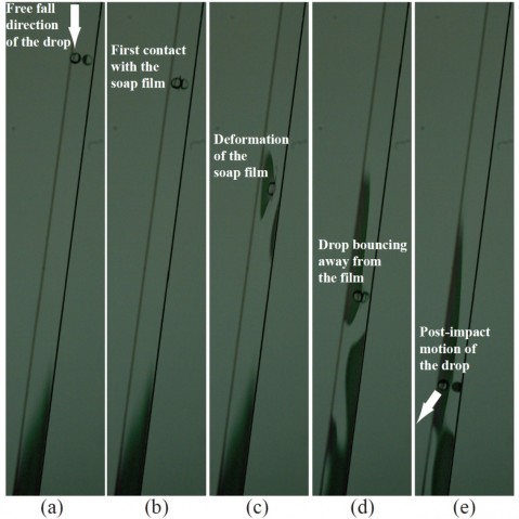 - Develops a force-based criterion, as a function of the spread radius of the drop at impact and the angle of inclination of the soap film.