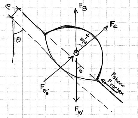 - Forces to be considered: interfacial tension, buoyancy, weight of the drop, elastic deformation forces. It is to be noted that the other hydrodynamic effects are in-plane with the film and hence do not affect the transverse direction dynamics.