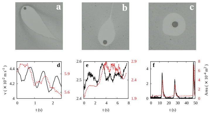 The continuity of the Marangoni force strength with time can be confirmed via visualization of the comet trail left behind the c-boat. In particular, the comet trail provides a visualization of the asymmetry in the CA distribution around the c-boat. The shape and size of the comet trail is, therefore, indicative of the nature of underlying dynamics. Direct visualization of the comet trail using tracer particles for the three modes of c-boat motion is shown in figure 3a-c. The reducing area of the comet trail suggests a decrease in the net marangoni force strength propelling the c-boat. The elliptical, comet shaped tracer free region in the harmonic mode (figure 3d) gives way to a nearly circular comet shape with a thin wispy tail in the steady mode (figure 3e). The relaxation oscillation mode results in a stationary c-boat with a circular region that grows with time, until a sudden jump in c-boat position results in a momentary comet shape before the c-boat once again settles into a stationary position with a growing circular area (figure 3f).
