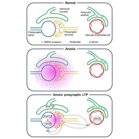 Transient anoxia causes amnesia and neuronal death. This is attributed to enhanced glutamate release and modeled as anoxia-induced long-term potentiation (aLTP). aLTP is mediated by glutamate receptors and nitric oxide (·NO) and occludes stimulation-induced LTP. We identified a signaling cascade downstream of ·NO leading to glutamate release and a glutamate-·NO loop regeneratively boosting aLTP. aLTP in entothelial ·NO synthase (eNOS)-knockout mice and blocking neuronal NOS (nNOS) activity suggested that both nNOS and eNOS contribute to aLTP. Immunostaining result showed that eNOS is predominantly expressed in vascular endothelia. Transient anoxia induced a long-lasting Ca2+ elevation in astrocytes that mirrored aLTP. Blocking astrocyte metabolism or depletion of the NMDA receptor ligand D-serine abolished eNOS-dependent aLTP, suggesting that astrocytic Ca2+ elevation stimulates D-serine release from endfeet to endothelia, thereby releasing ·NO synthesized by eNOS. Thus, the neuro-glial-endothelial axis is involved in long-term enhancement of glutamate release after transient anoxia.