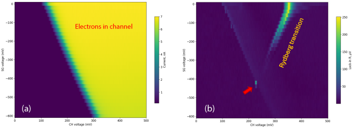 Figure 4: (a) Sommer-Tanner measurements of electron transport through the central channel. The border between yellow and dark-blue regions indicates the depletion of channel of electrons. (b) The image-charge signal of microwave-excited electrons showing the Rydberg transtion of electrons in the channel and a strong resonant signal at the depletion threshold (indicated by red arrow).
