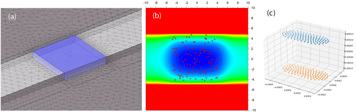 Figure 5: (a) FEM simulations of the trapping electrostatic potential. (b) MD simulations of N randomly placed electrons. (c) Equilibrium positions of N=100 electrons in the electrostatic trap.