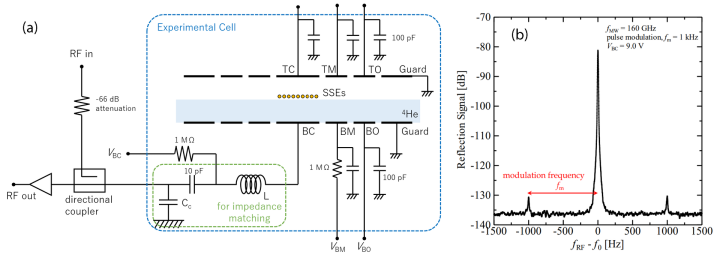 Figure 7: (a) Principle circuit of the RF reflectometry setup. The electron responce is detected by the RF signal at fRF~100 MHz refleced from a series LC ciruit coupled capacitively to the surface electrons (SSEs). (b) An example of RF reflection spectrum showing a sideband responce to the pulse-modulated microwave excitation at fm~1 kHz.