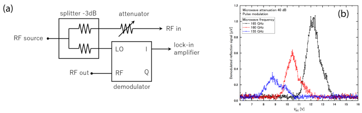 We carried out low temperature experiments to detect the Rydberg transition of many electrons (N~108) on the bulk liquid helium using the RF reflectometry method discussed earlier (see FY2022 Annual Report). The principle circuit of the experiment is show in Fig. 7(a). The resonace signal is recorded as a sideband signal in the RF reflection spectrum at the frequencies f0+/-fm, where f0 is the resonant frequency of the LC circut and fm is the modulation frequency of the microwave excitation.