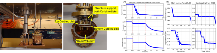 Figure 9: (Left) Photograph of the experiemental cell attached to 10 K stage of a GM cooler for solidification of neon. (Right) Time recordings of capacitance, temperature and pressure of neon vapor in the experimental cell showing solidification of neon (plateau in temperature) at the tripple point Tc~24.6 K.