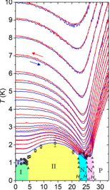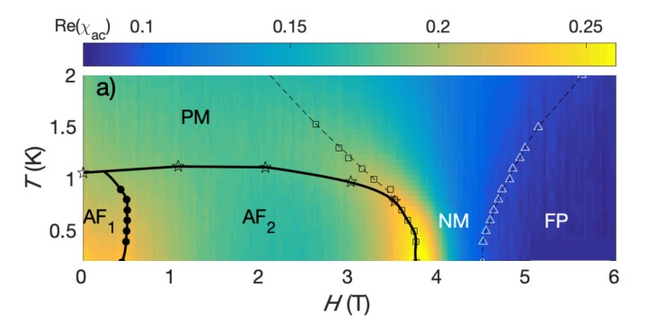 Fig.5 Magnetic phase diagram of BaCdVO(PO4)2, as determined by measurements of magnetic susceptibility, showing how conventional magnetic order vanishes for fields approaching 4T, providing evidence for a new non-magnetic phase where spin-nematic order has been predicted.