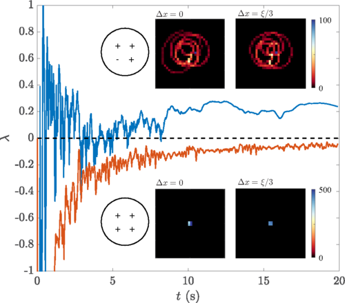 ig.6 : The insets show the histograms of the COM trajectories calculated over 20 s of evolution for the system of four vortices when the position of a single vortex has been shifted by Δx=0ξ and Δx=ξ/3. The upper two panels depict the corresponding trajectories after the direction of rotation of a single vortex has been reversed, whereas the lower row displays the trajectories for the case where all vortices corotate. The main curve plots the corresponding Lyapunov exponents, calculated from the shown COM trajectories. The negative Lyapunov exponents (orange) indicate that shifting the vortex about the initial position still ensures the stability of vortex trajectories. Reversing the direction of circulation of a single vortex (blue) however leads to fluctuations about zero, eventually leading to a fully positive exponent.