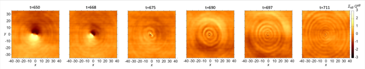 Series of images from simulation of the evolution of a pair of vortices experiencing an attractive interaction, akin to gravity. As the vortices approach, analogue gravitational waves are emitted, reminiscent of LIGO observations. Upon annihilation, there is a distinct wave train emitted associated to the annihilation event.