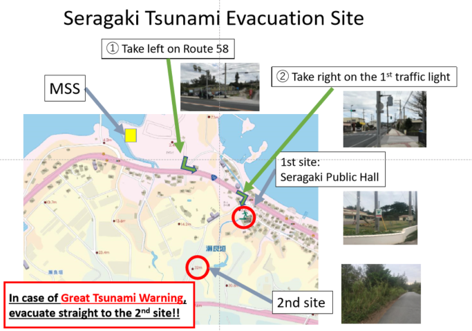 - If a major tsunami warning with huge tsunami height is issued, evacuate to the building of the Onna Sub Base ASDF.