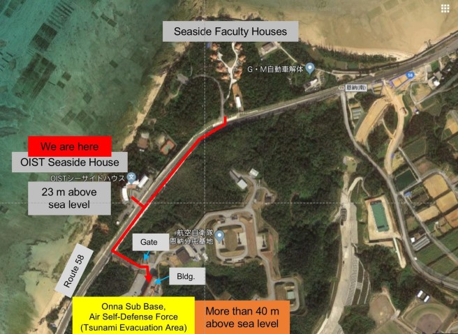 The OIST main campus is located more than 50m above sea level. You stay here in case Major Tsunami Warning with Huge Tsunami was issued by the Japan Meteorological Agency.