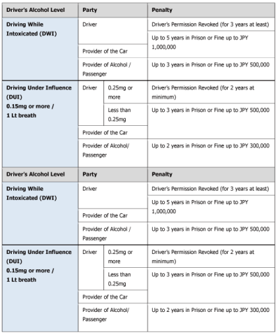 Japan has a zero-tolerance policy towards drink-driving, penalty on DUI offense is always heavy.