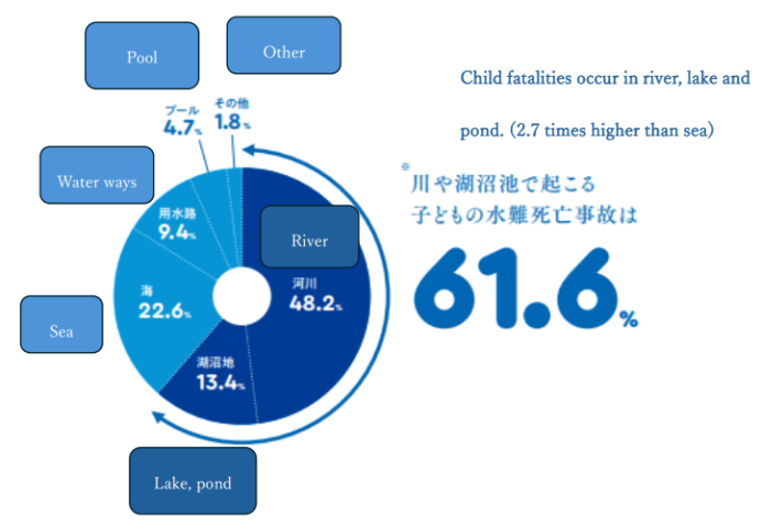61% of water-related accidents involving children and young age (age 3-14) occur in rivers, lakes and ponds.