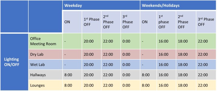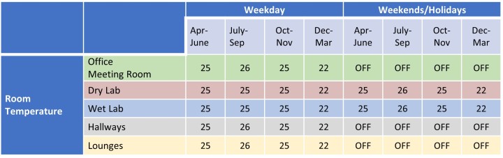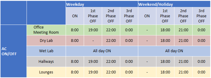 CERI is a concerted effort to reduce OIST’s carbon footprint. The first stage in the initiative includes adjusting lighting settings, and heating, ventilation, and air conditioning (HVAC) system settings in all buildings, to improve efficiency. The charts below describe new schedules for lighting and HVAC. Lighting and the HVAC system can still be controlled manually in each room, so please continue to turn lights off and reset the thermostat when leaving a room.