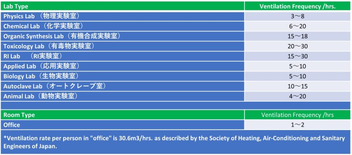 - The following is a suggested ventilation schedule published by the Society of Heating, Air-Conditioning and Sanitary Engineers of Japan. BFM will use it as a baseline for creating the room ventilation schedule.