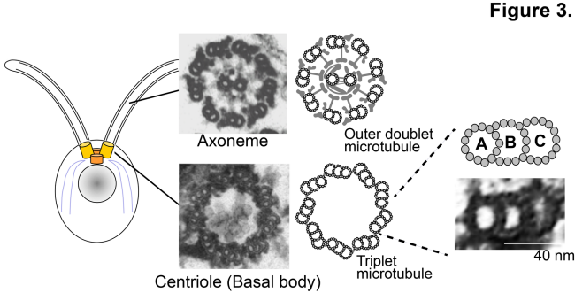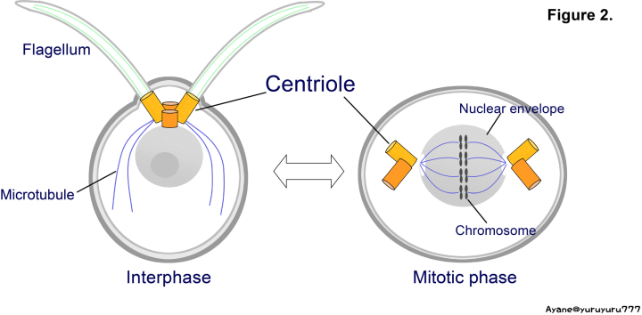 I’m studying centriole assembly using green alga Chlamydomonas reinhardtii, a unicellular organism that swims using two flagella (Fig.1).